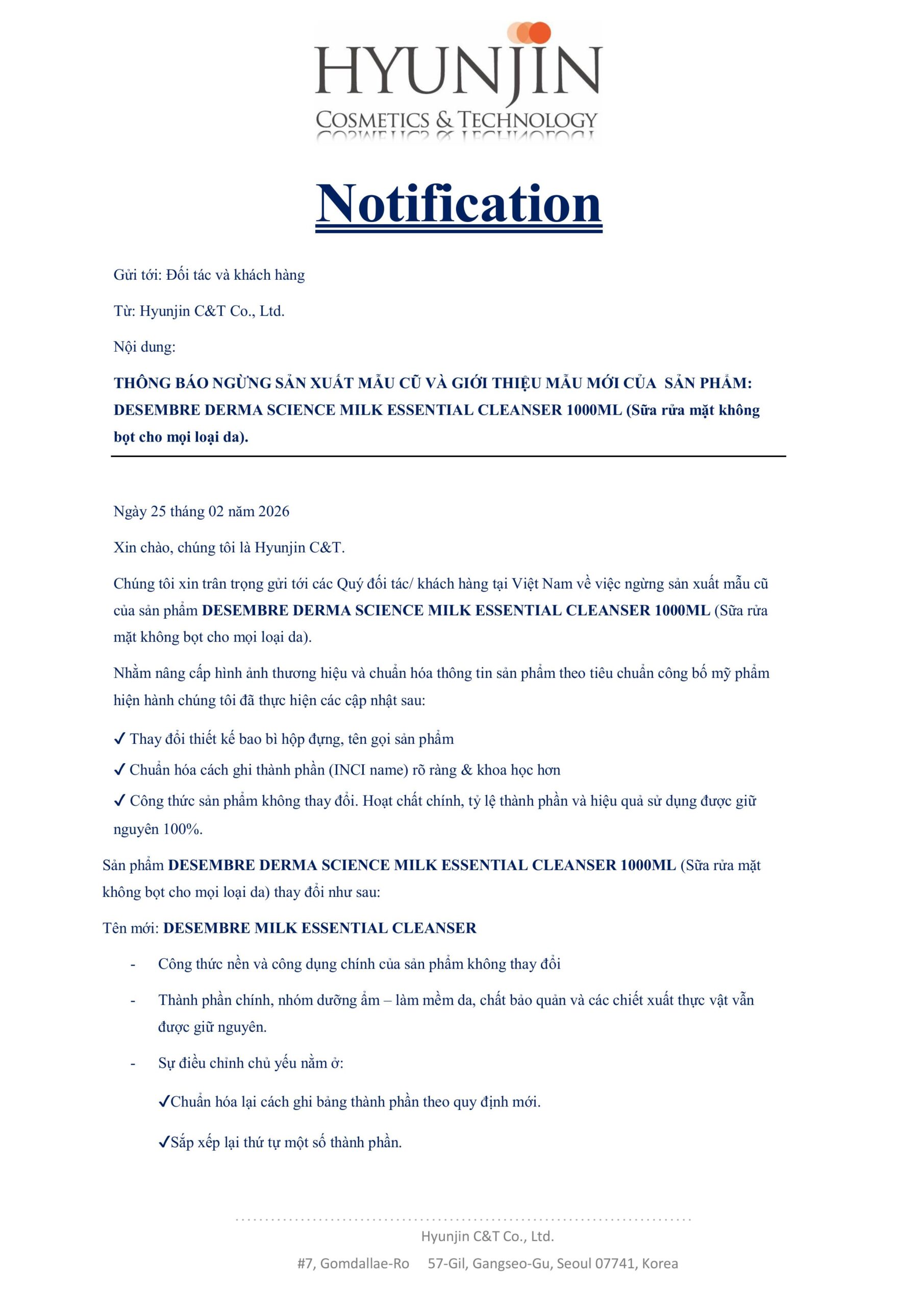 Thông tin, Tin tức Thông Báo: Thay Đổi Mẫu Mã Sản Phẩm Milk Essential Cleanser 1000ml Posted on 26/02/202607/04/2026 by Trang Yến 26 Th2 Thông Báo: Thay Đổi Mẫu Mã Sản Phẩm Brilliant 24h Care Cream 200g Thông Báo: Thay Đổi Mẫu Mã Sản Phẩm Massage Cream